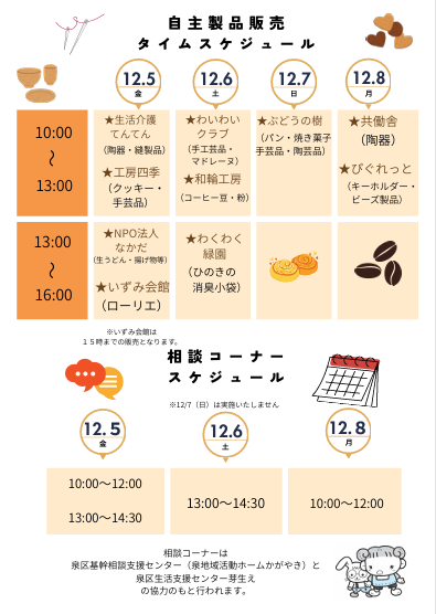 パンやお菓子・陶芸作品などの自主製品販売のほか、泉区内の相談支援機関による相談コーナーも設置します。(※一部の時間帯では行っておりません。詳細は下記のチラシをご参照ください。)