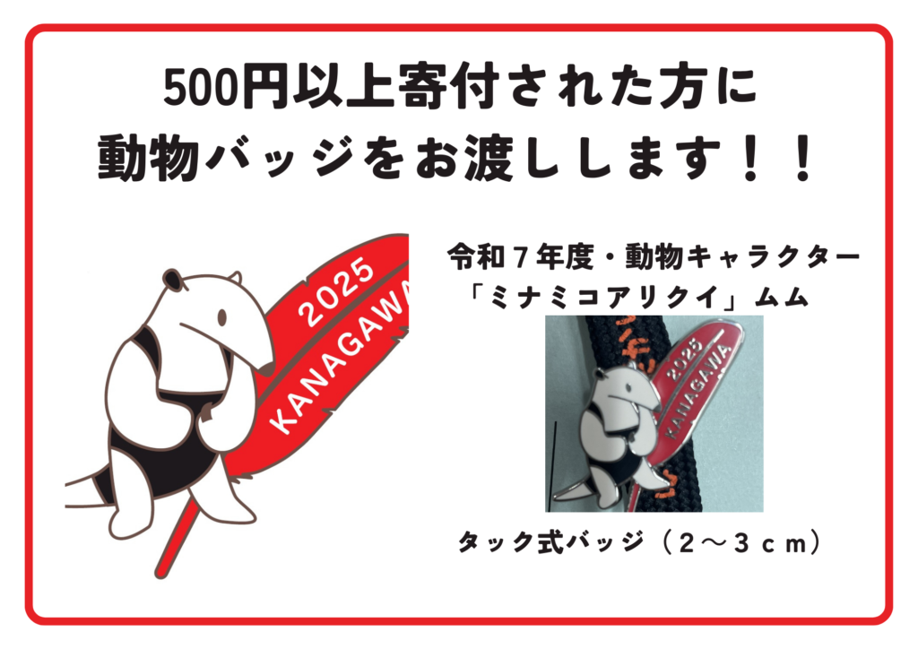 募金にご協力いただい方には、赤い羽根共同募金PR大使野毛山動物園のミナミコアリクイの「ムム」の動物バッジや、